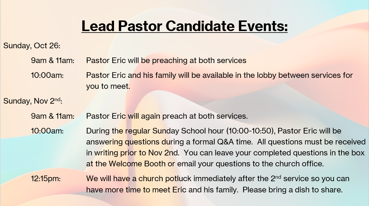 • Oct 26 & Nov 2 - Pastor Candidate Eric Holtrop preaching