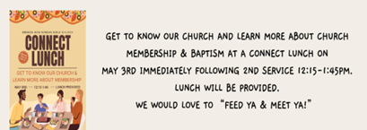 The Senior Saints will have a potluck dinner Sunday, April 13th from 12:30 – 1:30 pm. Please meet in the Café area following 2nd service and bring a dish to share.