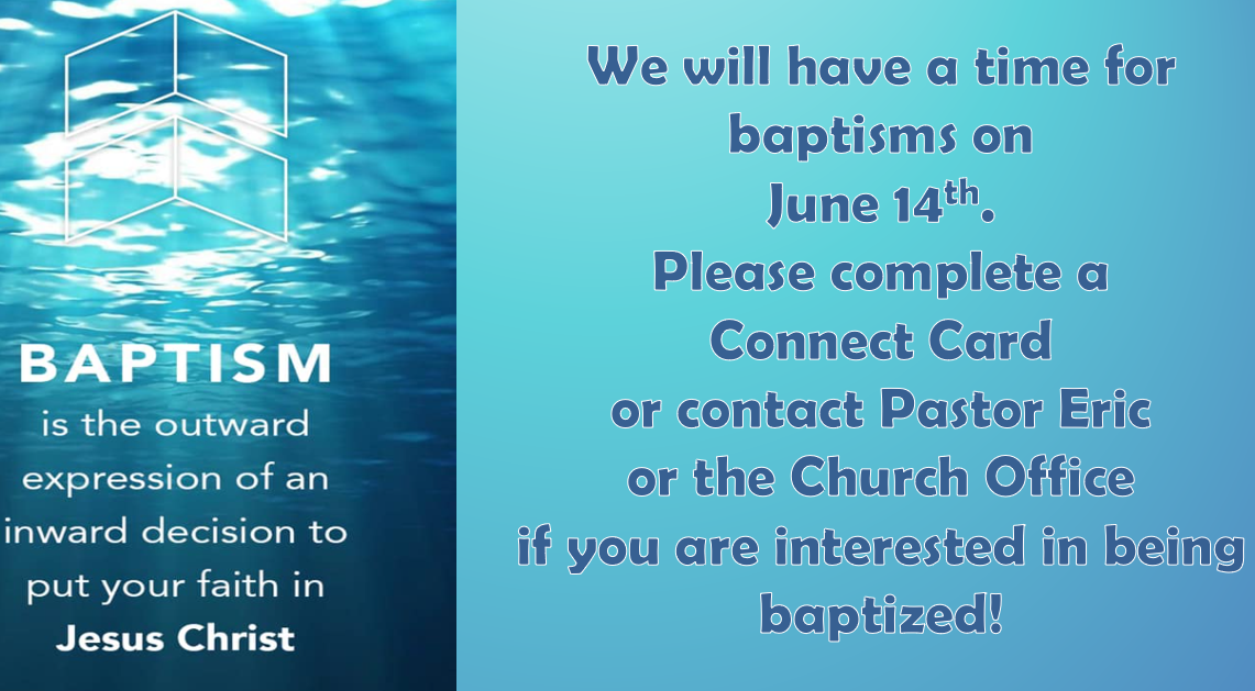 In order to give our Sunday School teachers a time of rest, we will not be holding Sunday School classes through the summer. The break will being on Sunday, June 2nd. Classes will resume, Sunday, September 8th.