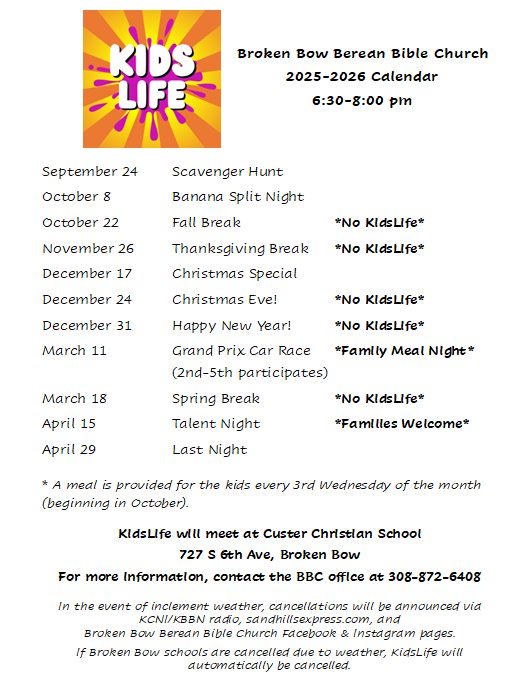 Each KidsLife meeting will include a time of worship, an activity, a memory verse, as well as Bible time, a snack, and games. All students can enter through the main doors on the East side of the school. Children are invited to bring their Bibles and friends! We hope your child will be able to join us for an encouraging evening of knowing God better!